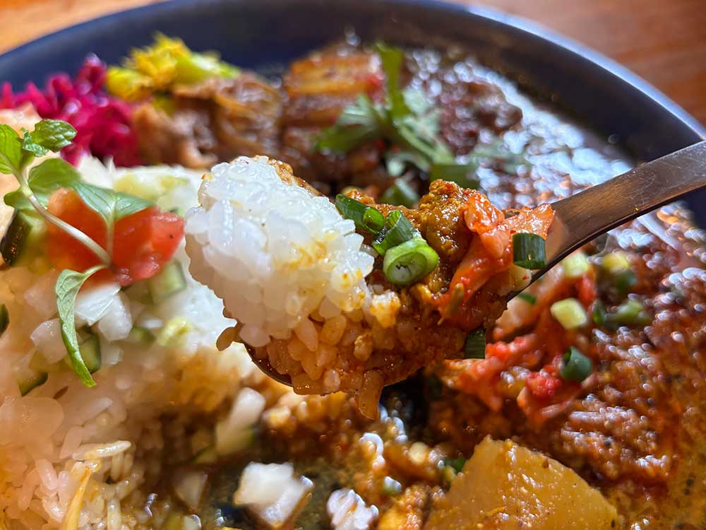 編集部が伺った際は、定番のチキンカレーに加え、「ピリ辛!チゲ味噌豚キーマ」と「牛バラSpiceすき焼きカレー」が用意されていました。