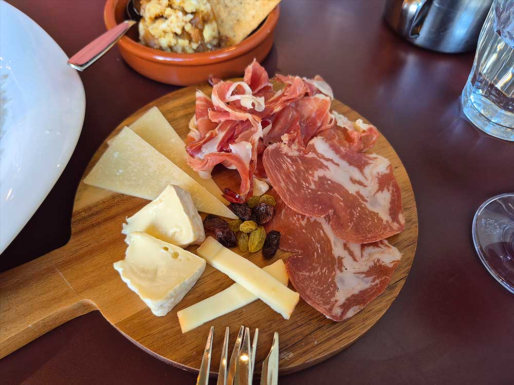 3種類のチーズ、2種類の生ハム、乾燥レーズンの盛り合わせです。