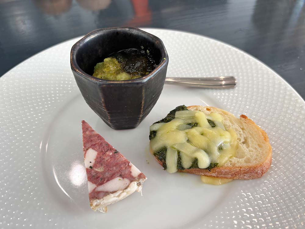 パテドカンパーニュ(左手前)・菜の花とコンソメのジュレ(奥)・春菊ジェノベーゼチーズバゲット(右)の3種類をいただきました。