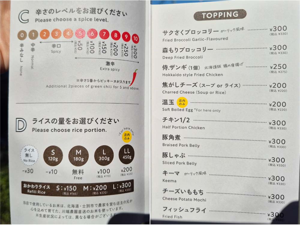 次に左側から辛さ・ライスの量を選び、右からトッピングを選びます。