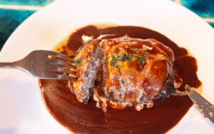 肉肉しい系の食べ応えあるハンバーグ。ソースたっぷりで、ごはんが止まらない!
