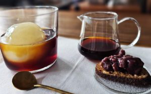 氷出しで作った煎茶の丸氷に、低温で抽出した”グアテマラ エルインヘルト ウノ”を流していただきます。