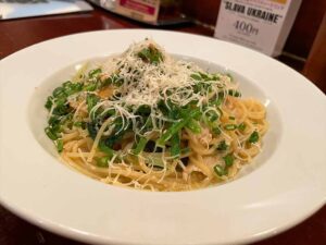 程よい塩気のある和風ソースが、爽やかなネギと芳醇なチーズに合わさっておいしいです。